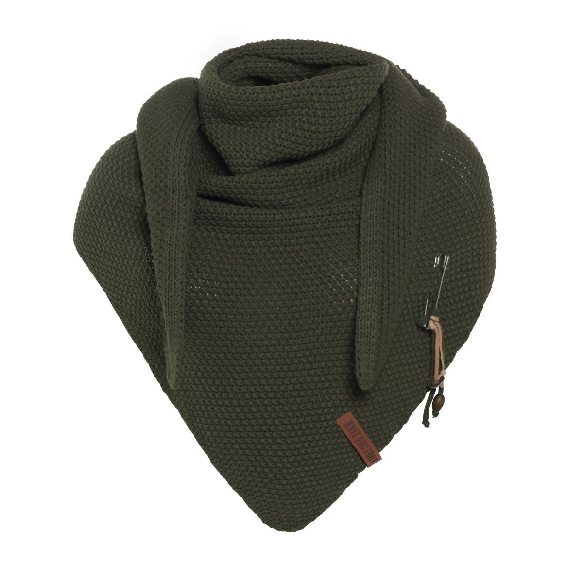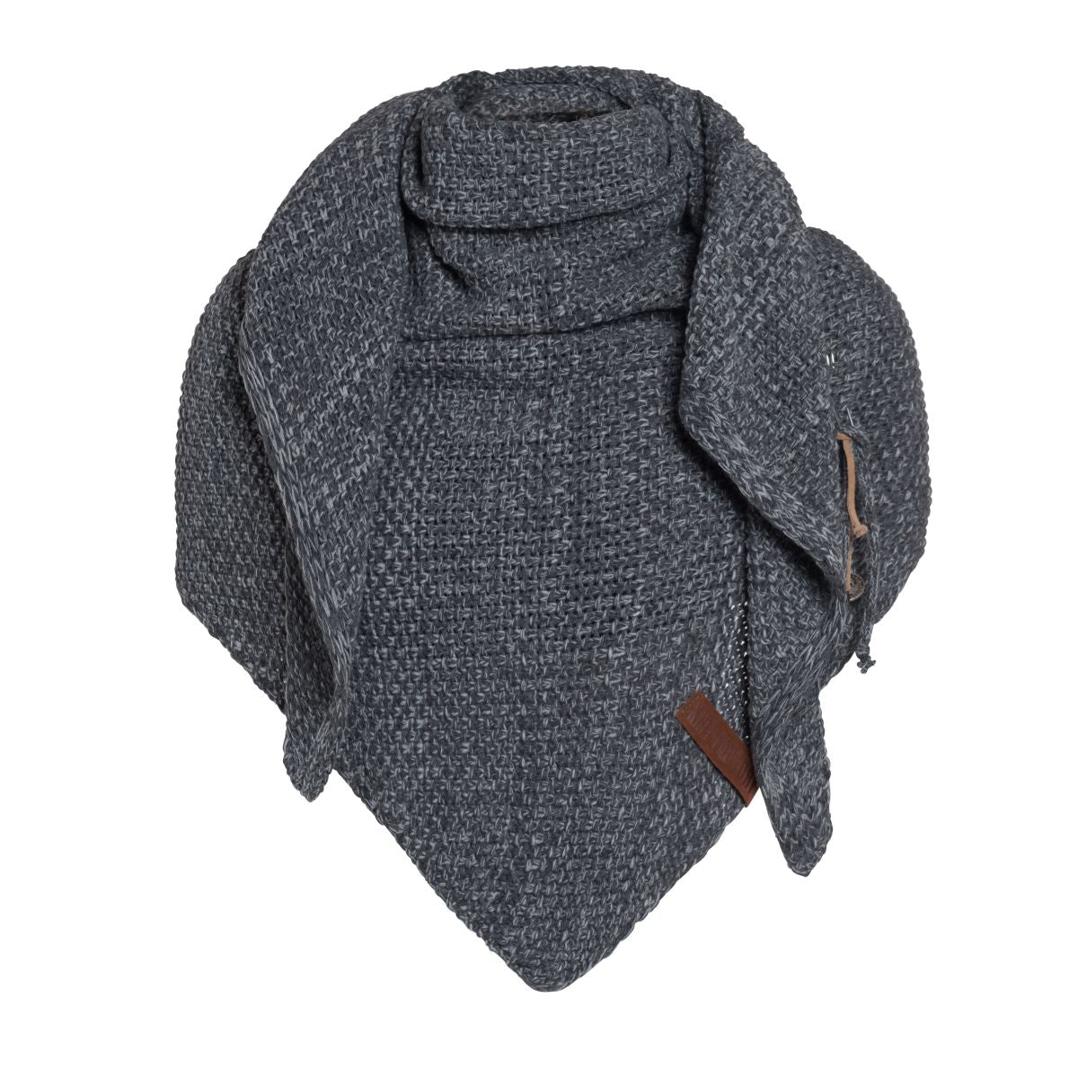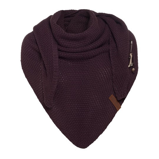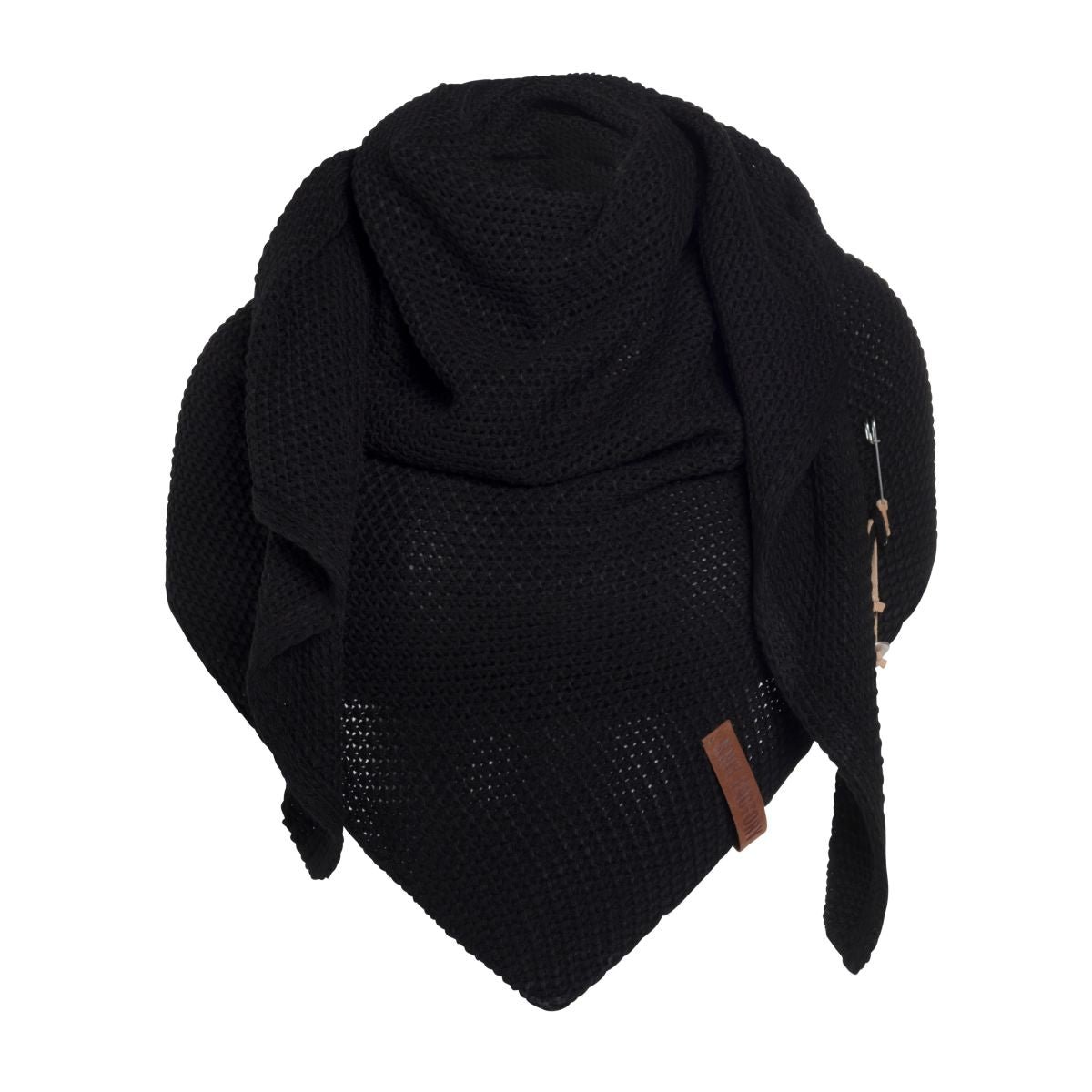 A wonderfully generous, knitted shawl in a beautiful fantasy stitch. Thanks to the handy triangle, this oversized scarf can be worn in several ways. Complete your outfit with this beautiful, stylish scarf. The Coco Shawl features the characteristic tough leather Knit Factory label and a kilt pin with matching accessories. The shawl is available in various fashionable colours.