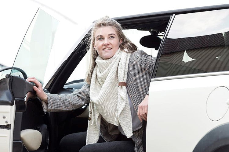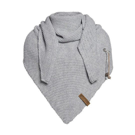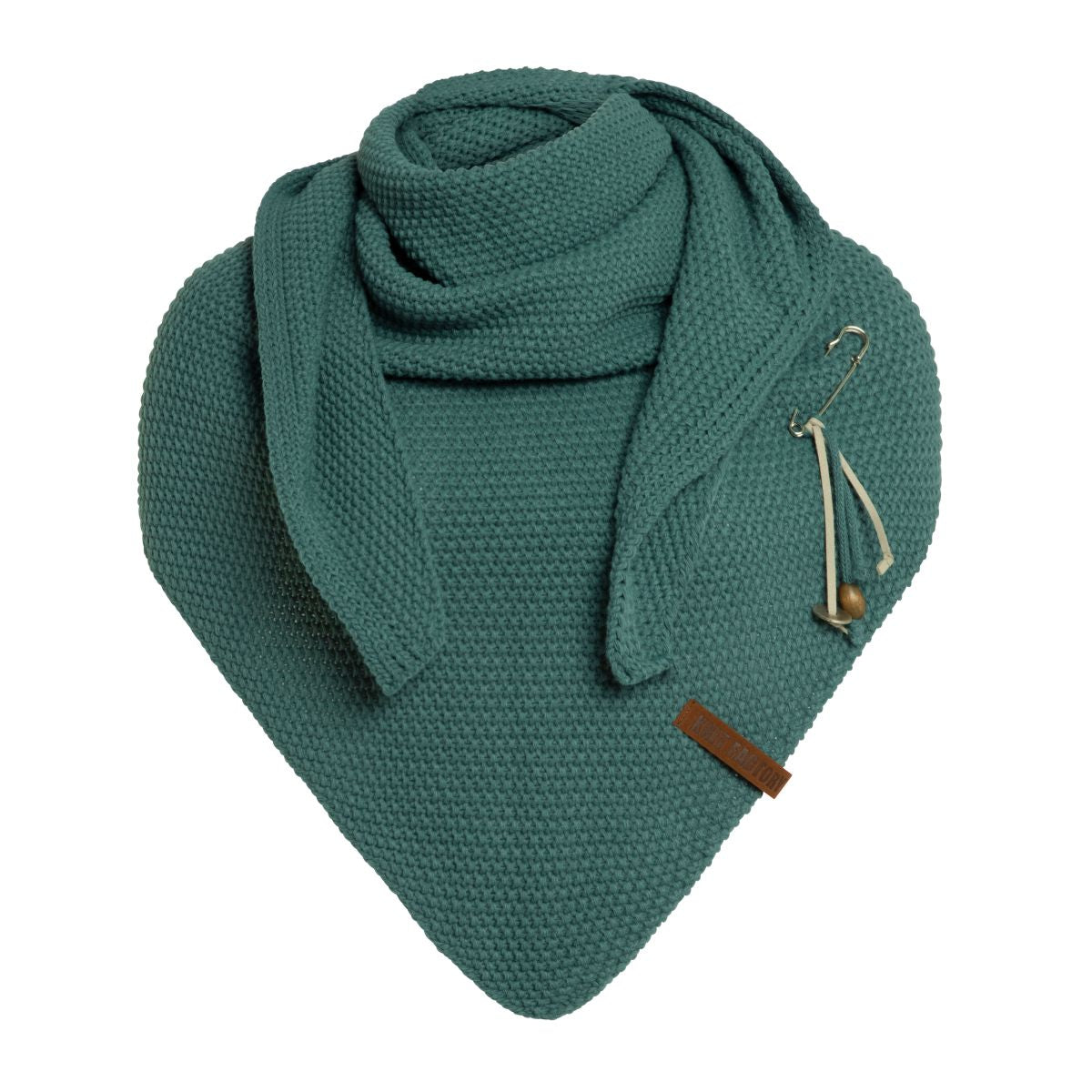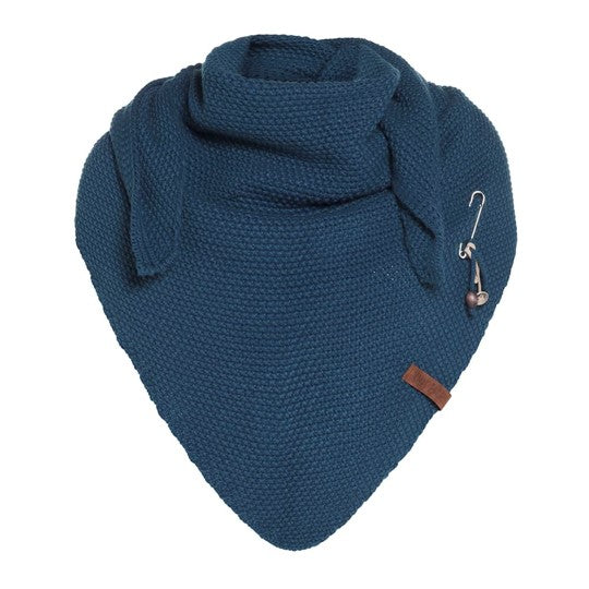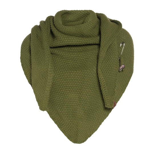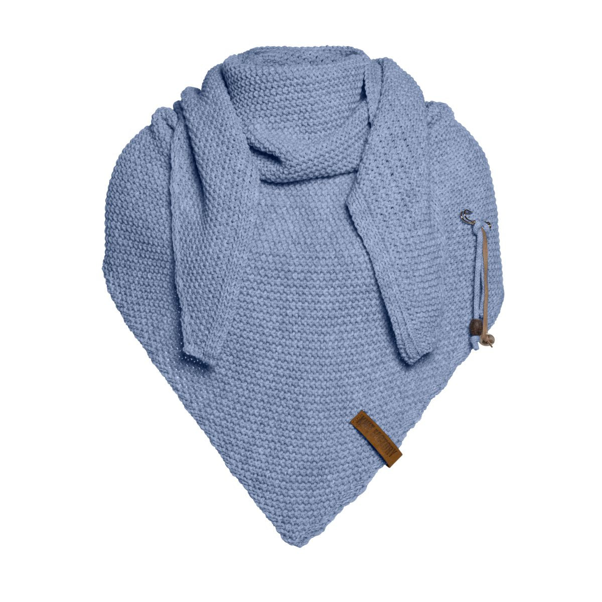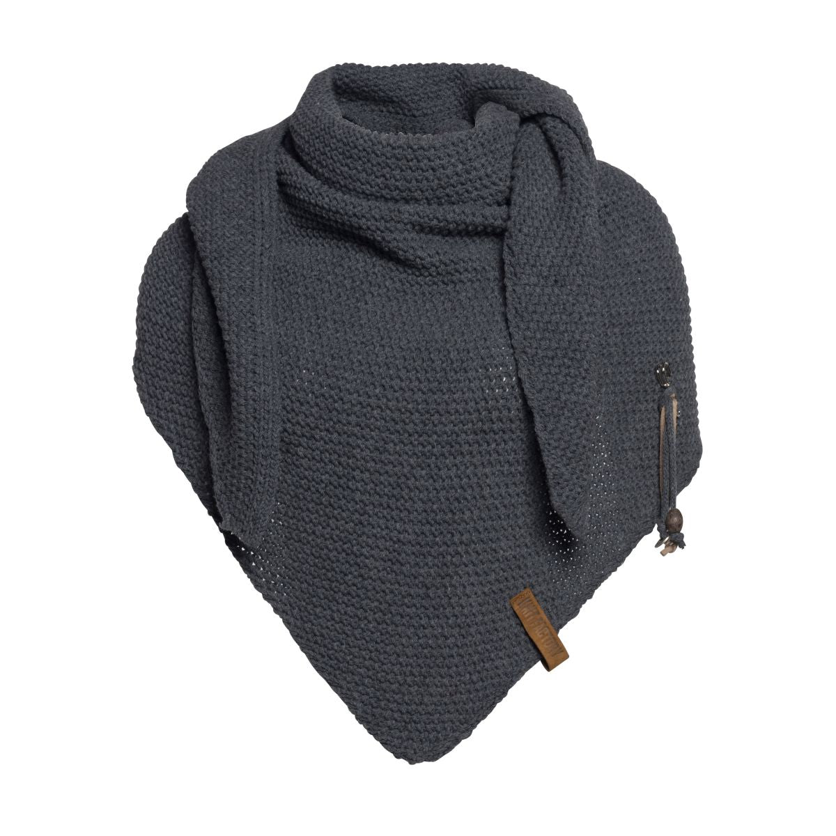 A wonderfully generous, knitted shawl in a beautiful fantasy stitch. Thanks to the handy triangle, this oversized scarf can be worn in several ways. Complete your outfit with this beautiful, stylish scarf. The Coco Shawl features the characteristic tough leather Knit Factory label and a kilt pin with matching accessories. The shawl is available in various fashionable colours.
