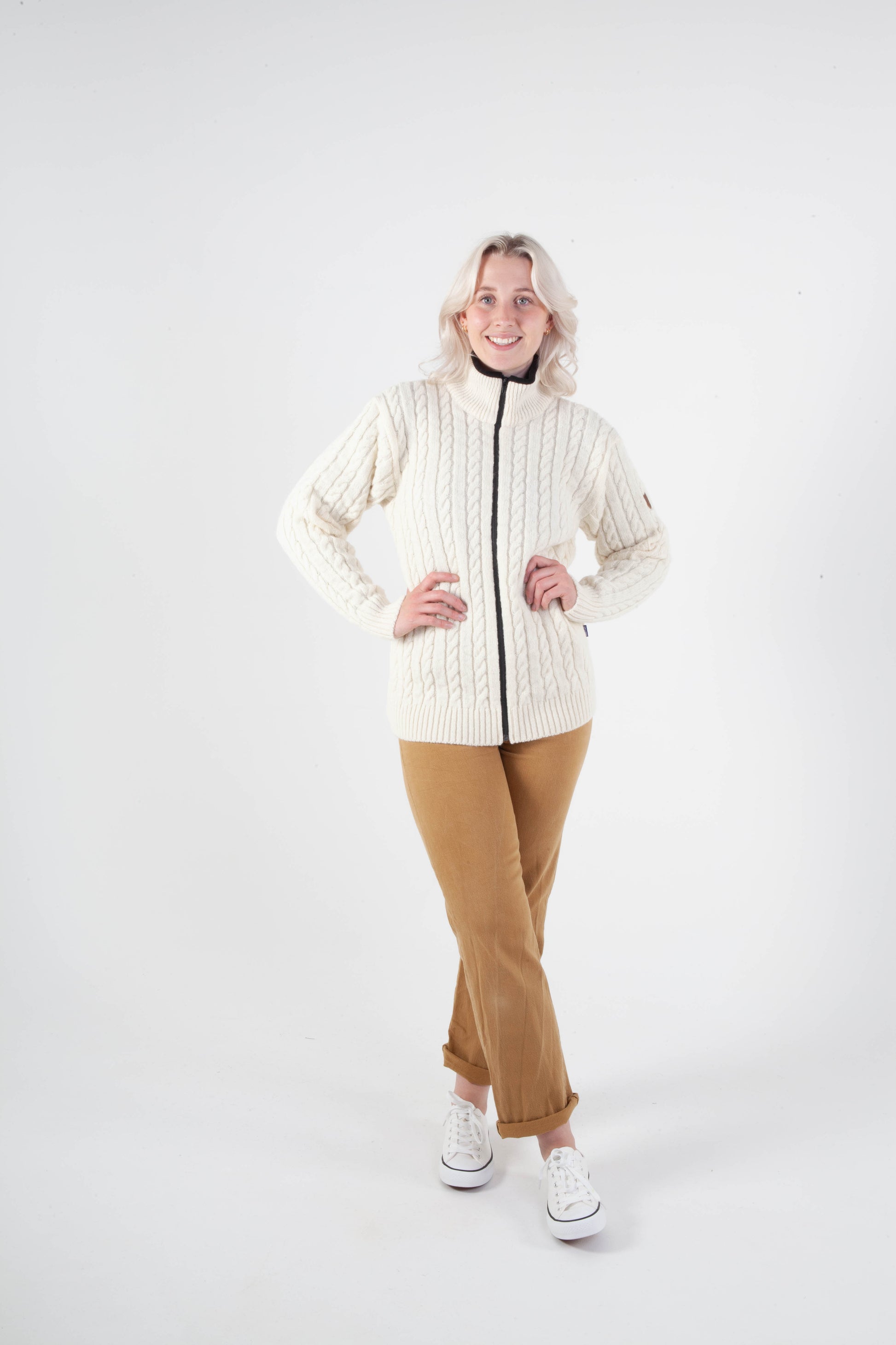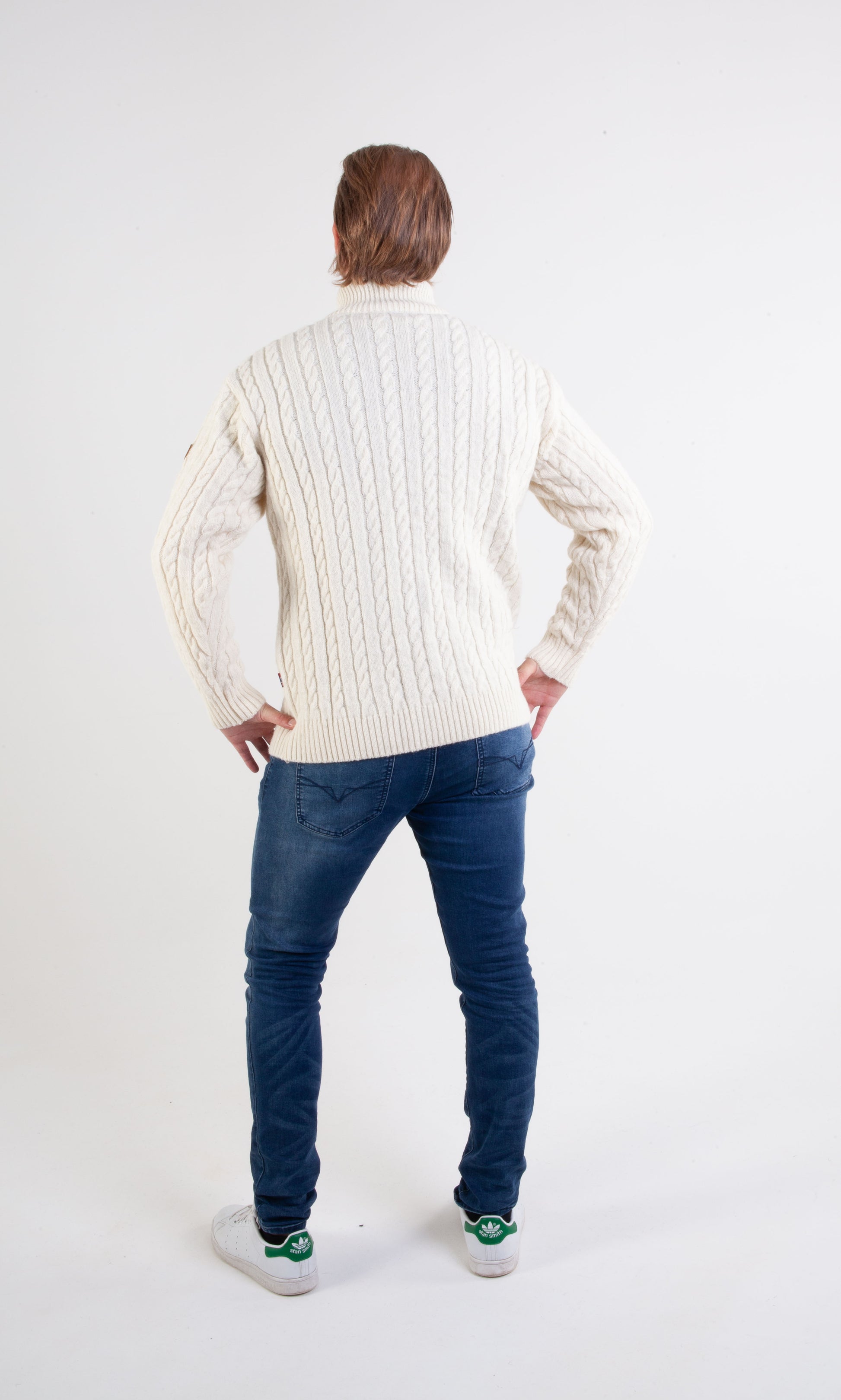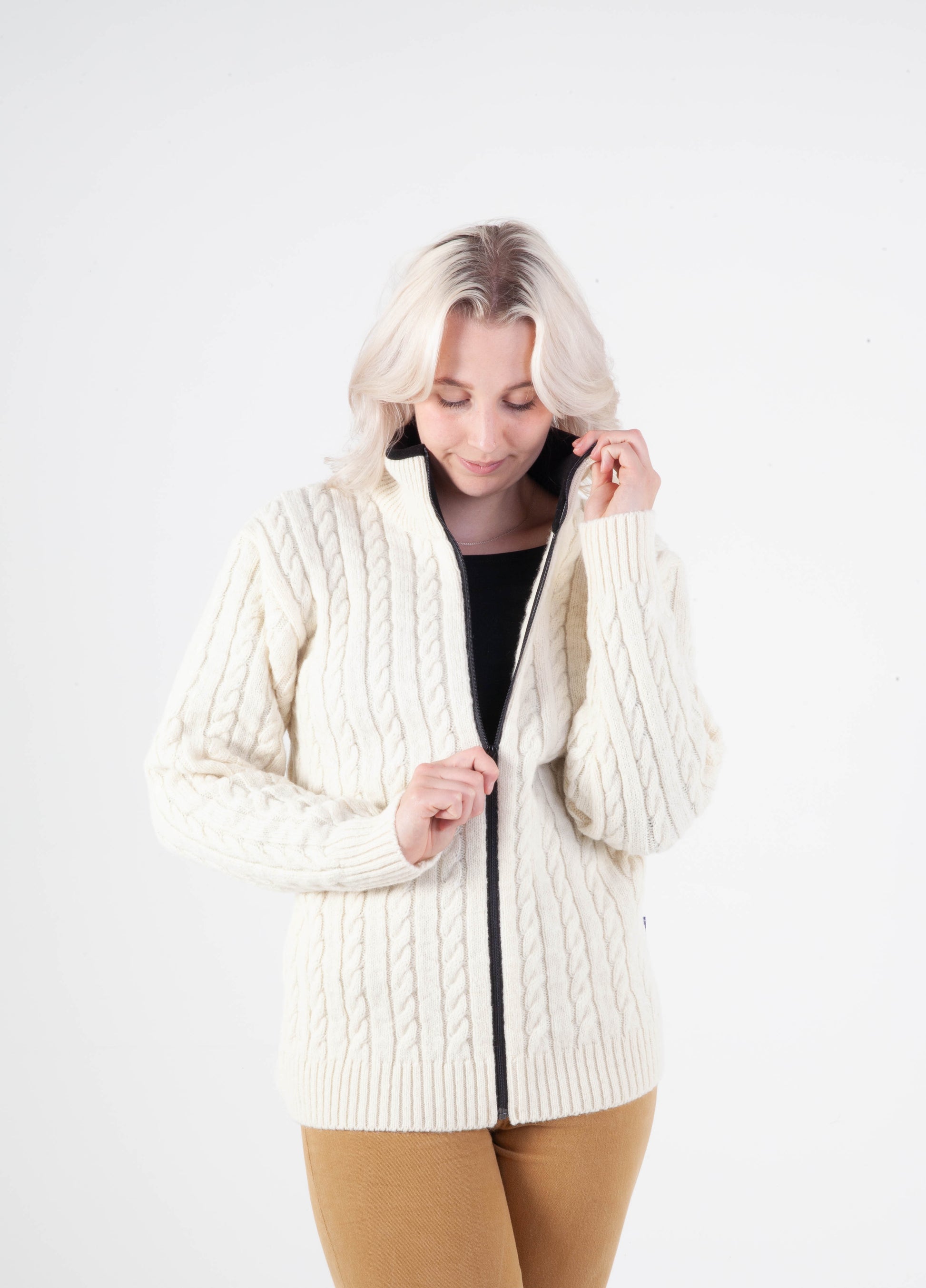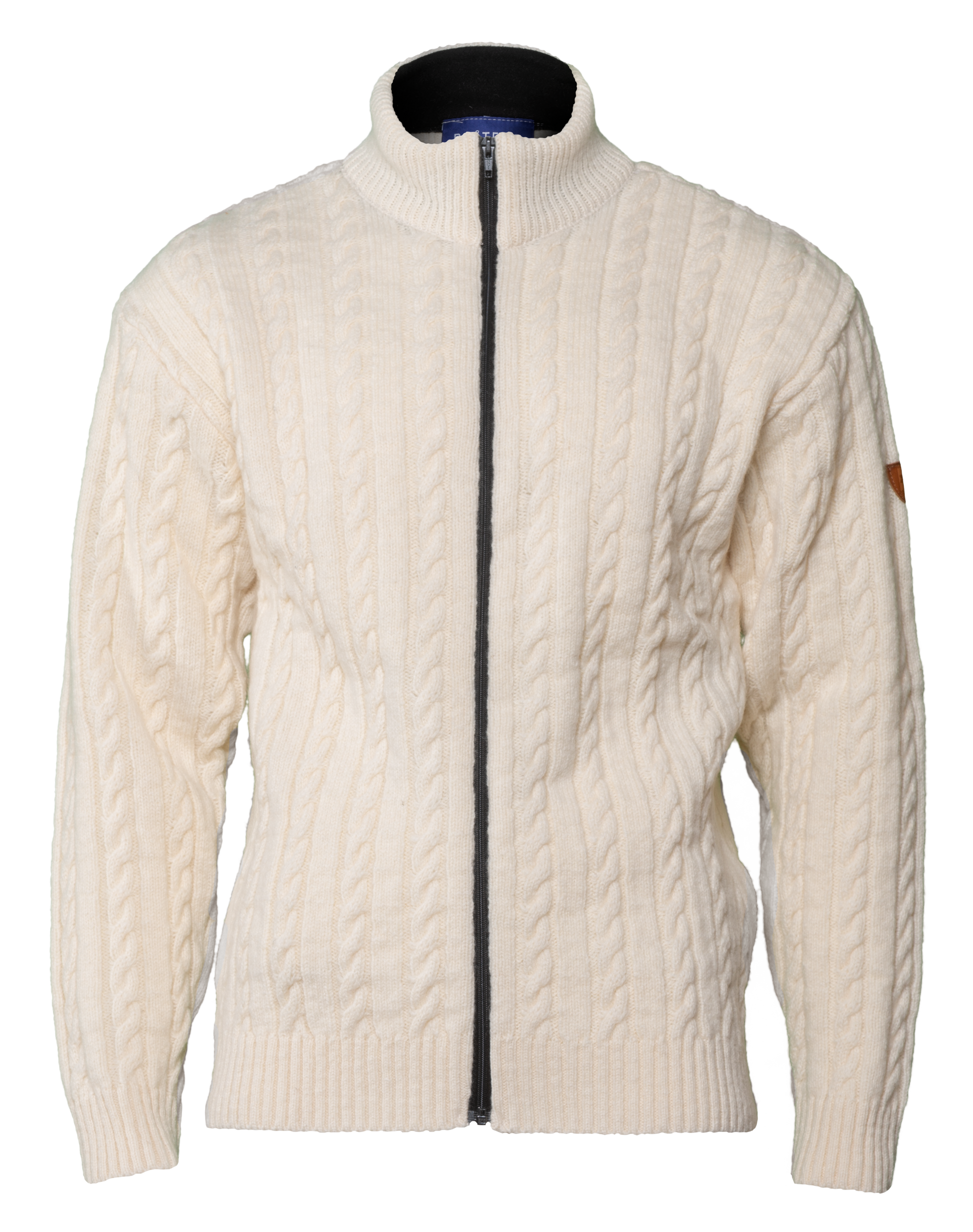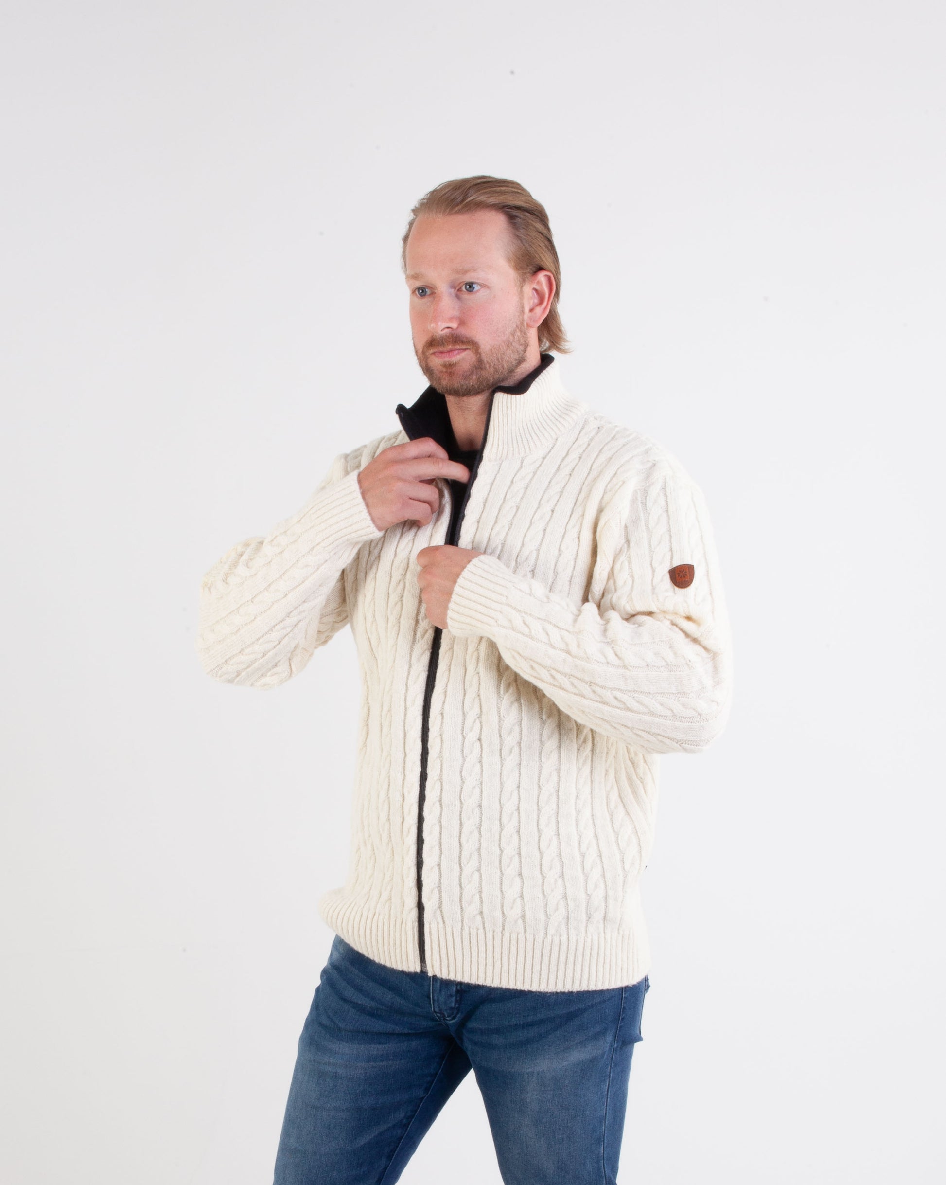 This rugged, warm men's cardigan is made of Norwegian sheep wool. Knitted in a beautiful cable knit and featuring a zipper. The cuffs are ribbed, and the collar is lined with soft fleece. A wonderfully warm addition to your wardrobe!