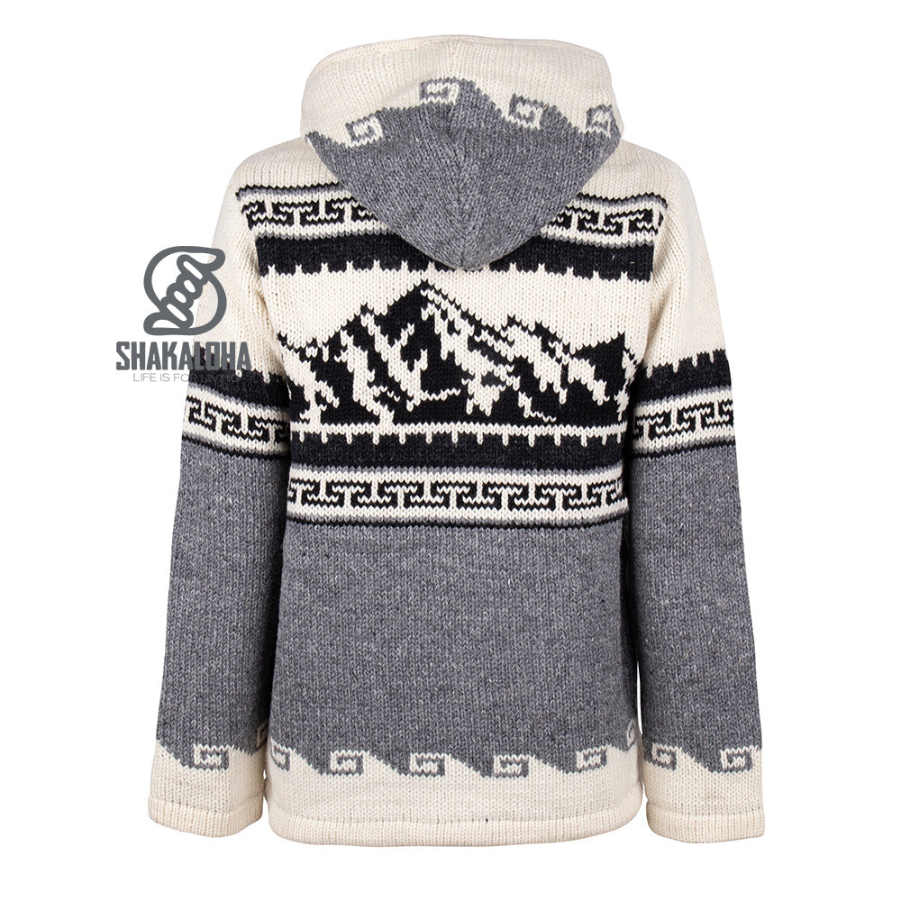 The Shakaloha Alaska men's vest is a warm woolen men's vest with a removable hood. The cardigan has a knitted pattern with mountains and various elegant details. The lower part of the torso and the sleeves are knitted in a plain gray. The vest has a zipper and a soft fleece lining.