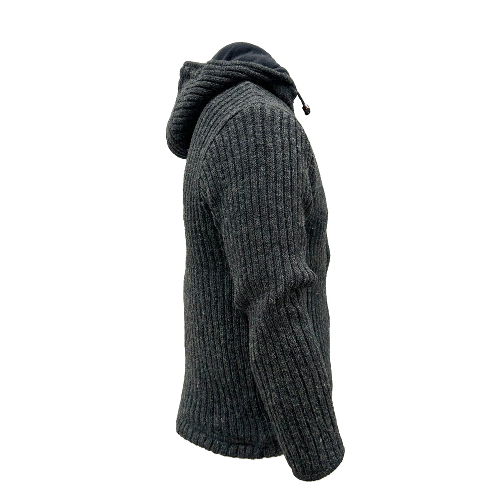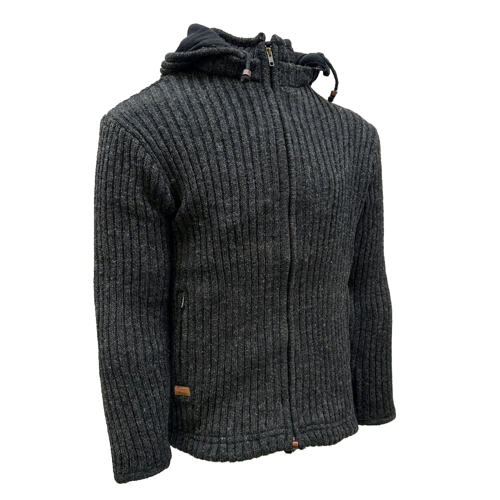 The Ribbed Jacket is made of 100% natural wool. The rib knitted cardigan has a soft, supple fleece lining and a detachable hood. This handmade cardigan from Nepal is perfect as a between-season jacket for chilly days. Ideal for a walk in nature or during a chilly summer evening on the terrace. Suitable for both women and men.