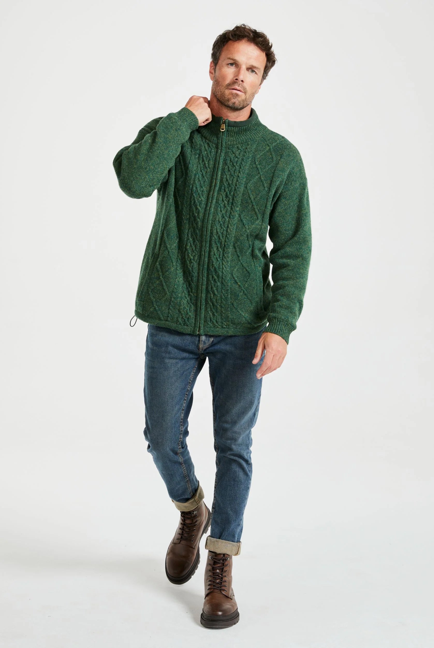 Herren-Cardigan mit Reißverschluss von Aran Woollen Mills, gestrickt aus reiner Schurwolle von Shetlandschafen. Die Strickjacke hat vorne verschiedene Strickmuster, darunter Rauten- und Zopfmuster. Die Weste hat einen Stehkragen, der mit weichem Fleece gefüttert ist. Die Weste selbst ist mit weicher Baumwolle gefüttert. Ein tolles Kleidungsstück, das Sie elegant über einem Hemd oder lässig mit T-Shirt und Jeans tragen können. Die reine Schurwolle sorgt für eine sehr angenehme Wärme.