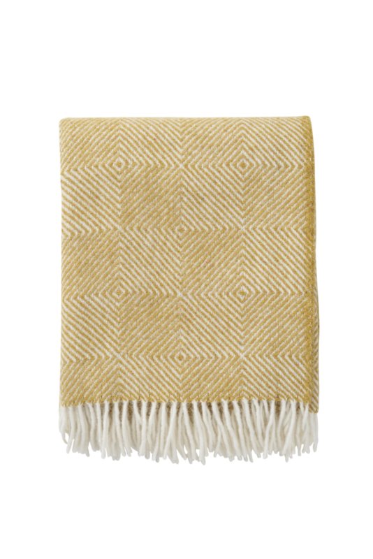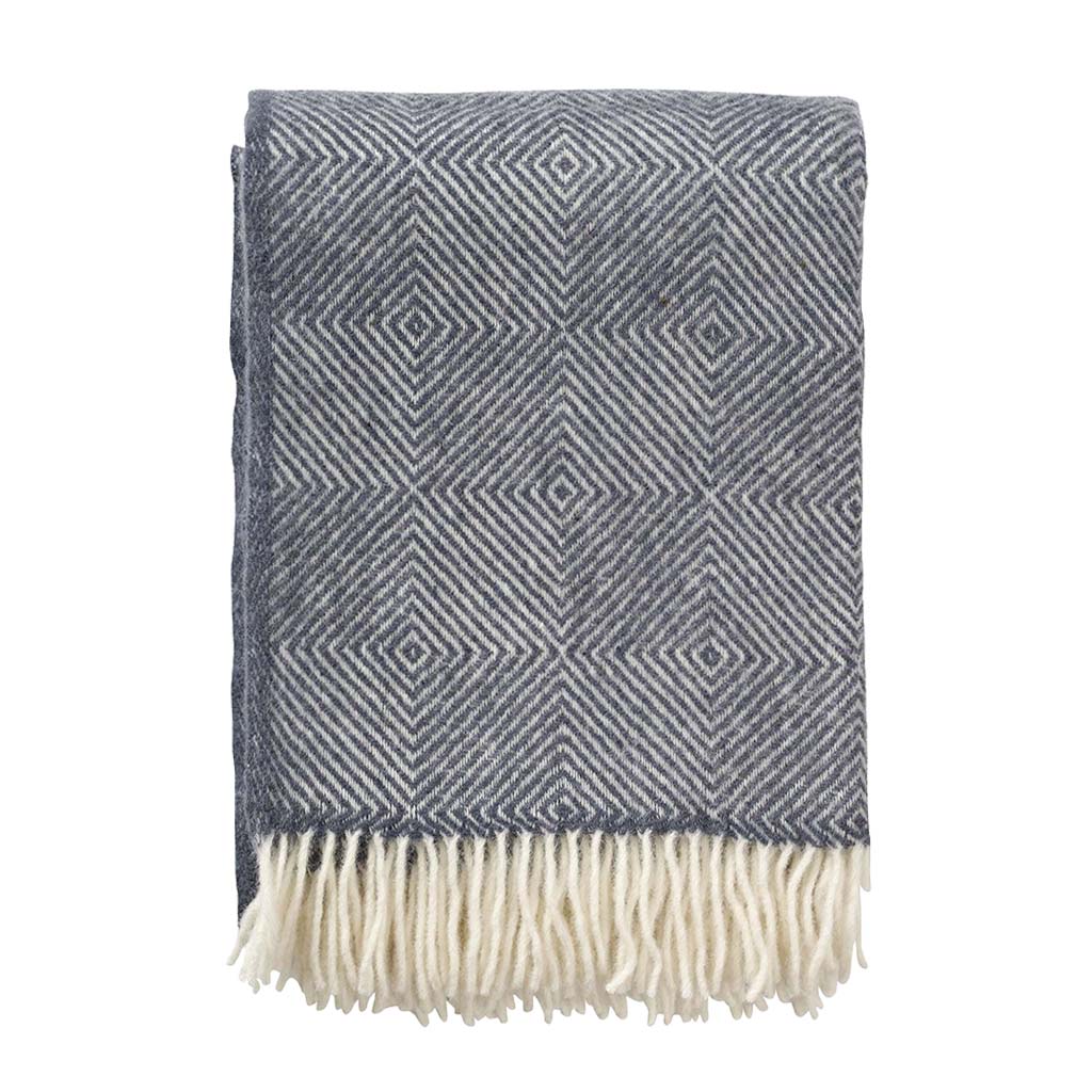 Stilvolles Plaid mit eingewebtem Rautenmuster und weißen Fransen. Dieses Plaid besteht aus Lammwolle, gemischt mit recycelter Wolle.