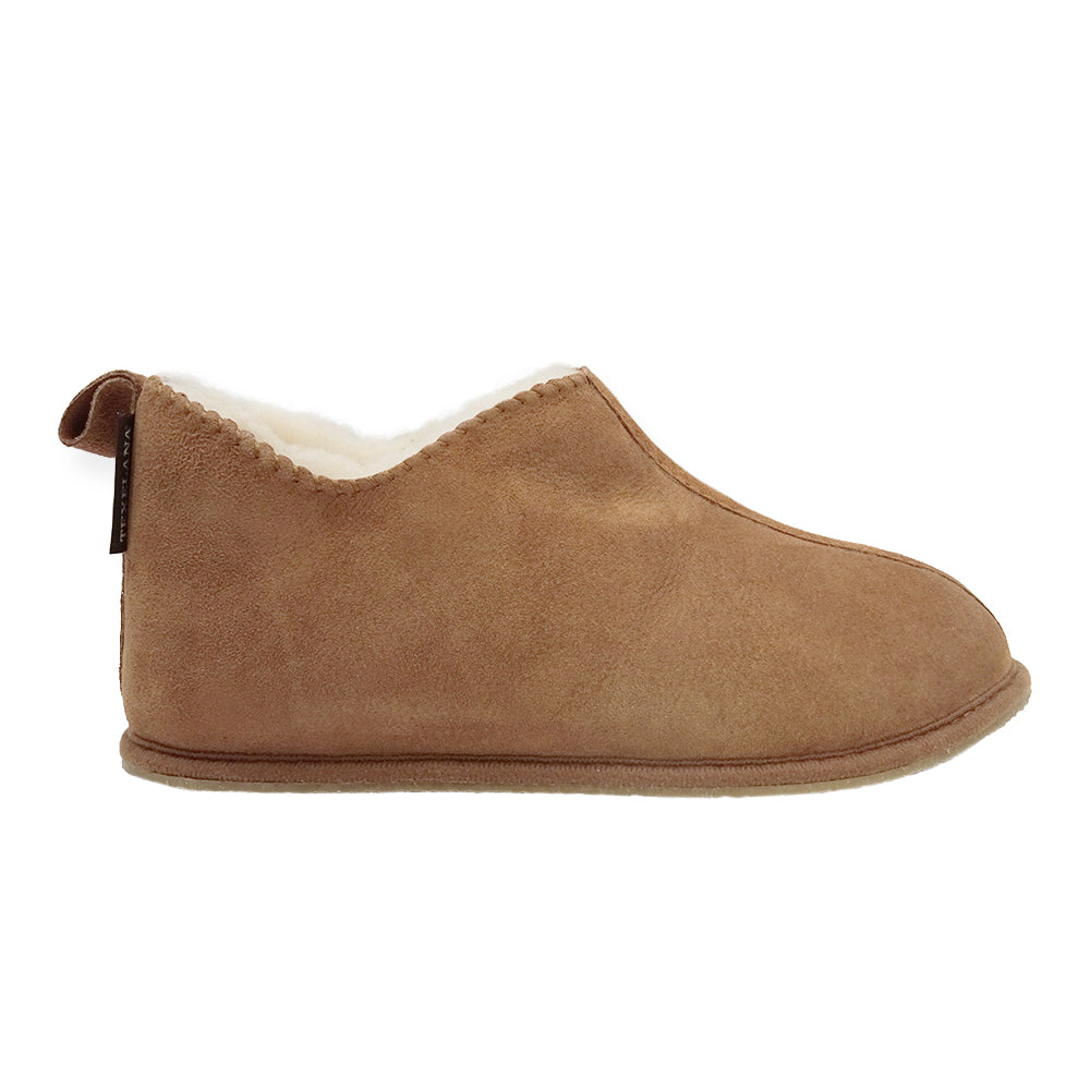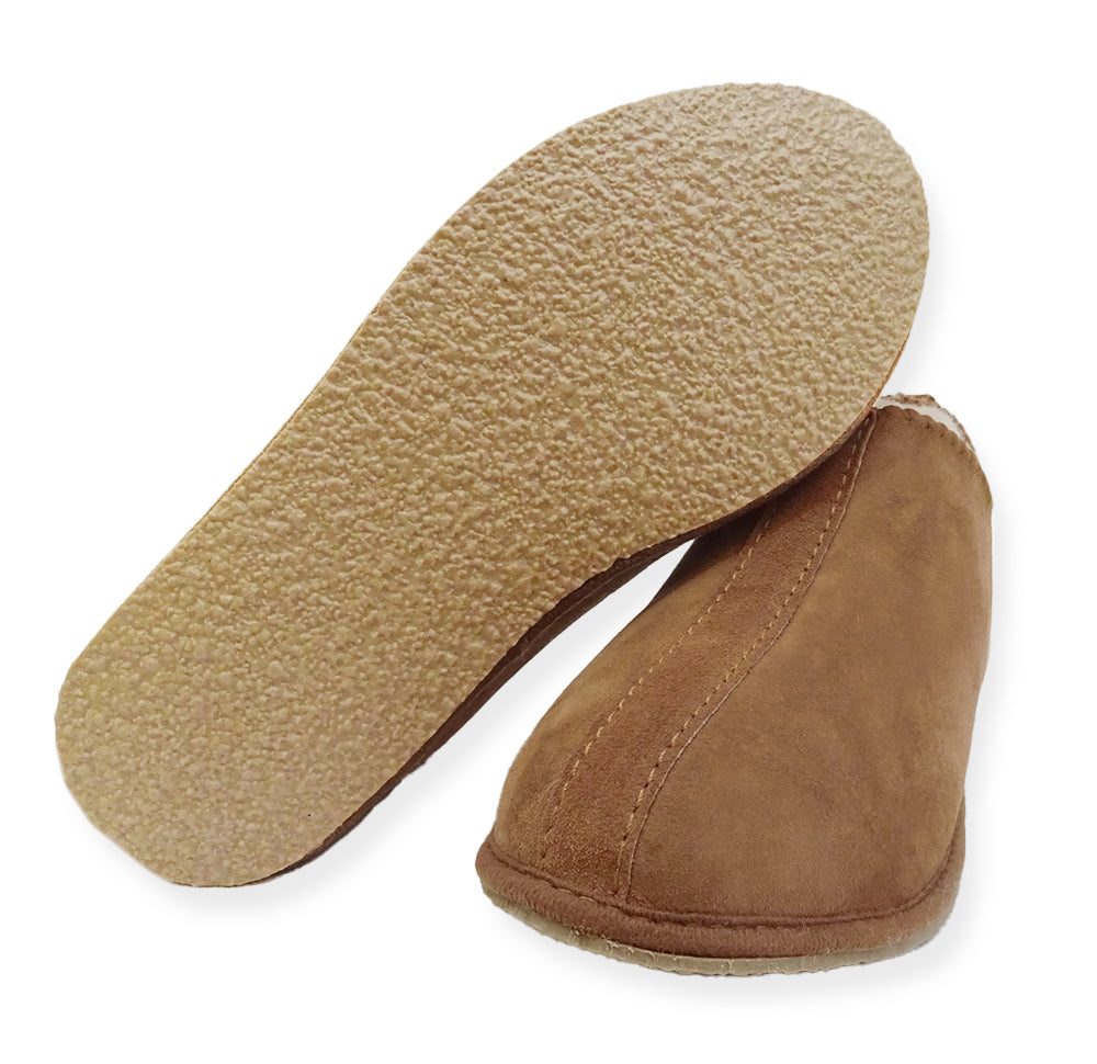 Hausschuhe aus Schaffell mit dünner Gummisohle.